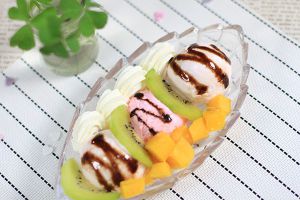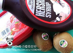 冰淇淋装杯,淋巧克力酱,加上自己喜欢的水果,就可以了