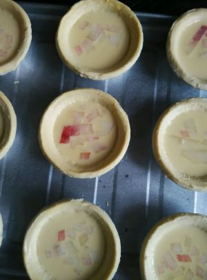 加入蛋挞皮中,可以稍微多一点,但是也不要太满。太少了没口感,太多了会溢出。图上就是太少了。