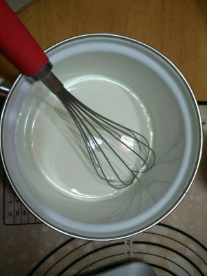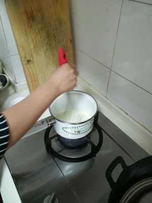 把白砂糖加入上步骤,开小火,边加边搅拌,等白砂糖完全融化就关火,不能把牛奶烧开了。