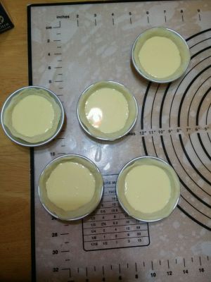 将冷藏的蛋塔皮放置解冻,倒入蛋挞液。放入烤箱,放中层,上下火170度,时间设定25min。