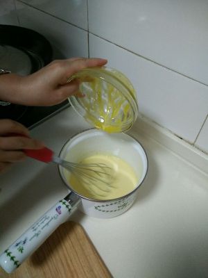 将搅拌好的蛋黄液倒入冷却好的牛奶液里,搅拌均匀