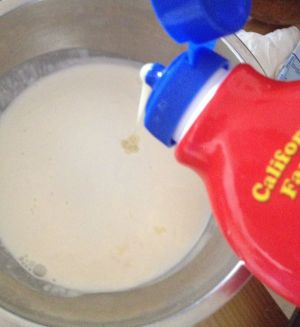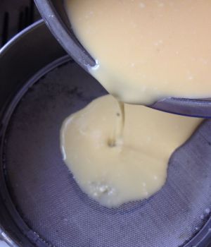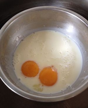 鸡蛋,牛奶,面粉适量,糖,一起拌匀,过滤。