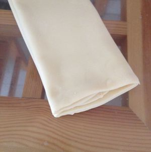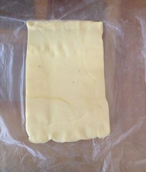 黄油切片放在保鲜膜内, 用擀面杖擀成长方形黄油片备用。