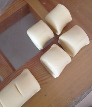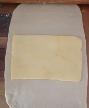 面团醒发后撒些粉,用擀面杖擀成长方形(长度是黄油片的三倍)。