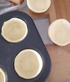 蛋挞皮粘粉朝上用手压成圆形,放入模具内,醒10分钟。