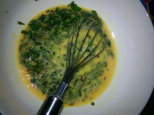 鸡蛋敲碎打散,将香椿末全部放入鸡蛋液里,加盐搅拌