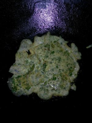 倒入鸡蛋,倒匀就可以了,小中小火煎一会儿,等鸡蛋成型再给它捣碎翻面