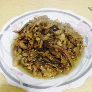 锅中倒入适量油,油热下洋葱,炒出香味后盛出备用,下入羊肉,肉变色后加入洋葱,倒入碗汁,出锅