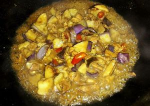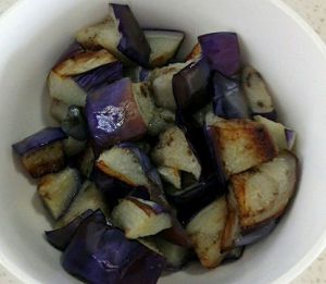 下入茄子块翻炒,之后加一碗水,用盐和酱油调味。