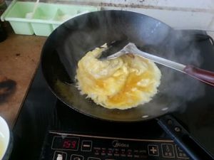 炒锅点火入油烧热,入鸡蛋液滑炒熟,盛出。