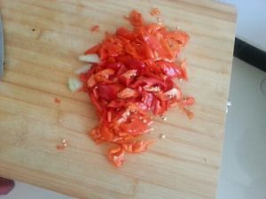 鸡蛋打散,青红椒洗净去蒂去筋膜,切三角形,葱,姜,蒜切片。
