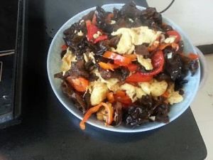 重新下油,大蒜头爆香,下木耳翻炒,加入盐,鸡精,料酒,下红椒,和煎好的蛋翻炒!太干的话加少于清水或高汤,起锅前放味精即可
