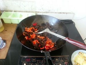 入木耳大火快炒,调入盐,胡椒粉翻炒均匀。