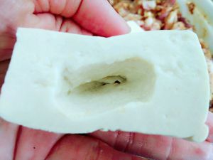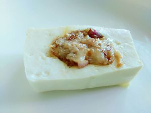 豆腐平均大小切小块,用勺子在豆腐中间挖出一些,挖出来的豆腐可跟馅拌一起再酿豆腐