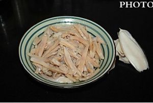 泡发好的干墨鱼去内脏,撕去薄膜,去骨后改切成条