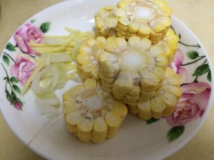 玉米碎成小段,大葱白切段,姜去皮切丝,备用。