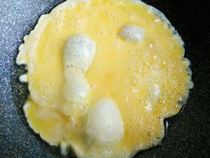 锅里放油,比炒菜稍微多一些,这道菜吃油,油熟了之后换小火(一定换小火),倒入搅拌好的韭菜鸡蛋,因为是小火不会糊,待半分钟翻个个儿,将成型的底面翻到上面,等到都成型了,就可以出锅开吃了。
