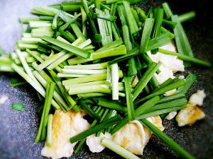 鸡蛋炒熟后加入切好的韭菜快速的翻炒几下(有点变色了就可以了,别炒太长时间,老了不好吃)