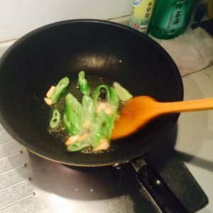 油热后放蒜片,蒜片炒出香味 再放青椒 喜欢吃辣的可以放干的红辣椒哦!