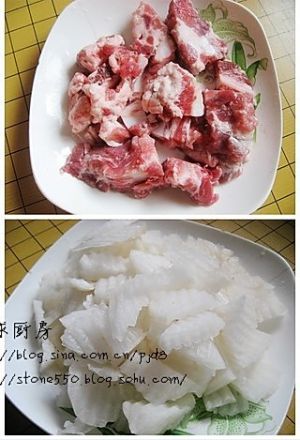 莲藕去皮切块,排骨洗净切块并用生粉,盐调味备用。