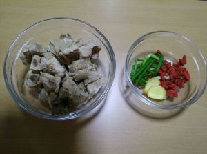 姜切片,小葱打结,枸杞洗净备甪; 排骨洗净,加入姜片焯水后,捞出冲净;