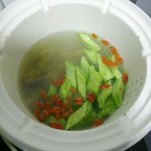 倒入苦瓜、枸杞再炖上20分钟左右,调入盐、胡椒粉,出锅前撒入香葱末。