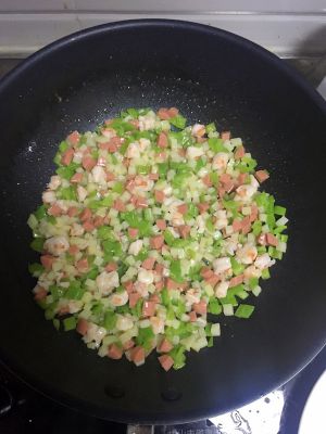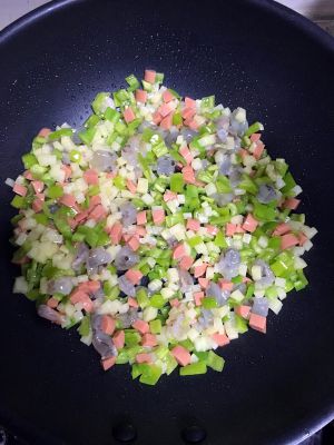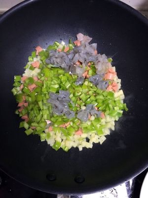肉和香菇先煽出味,然后将打散蛋液下锅煎成形,再放菜丁!放酱油,黑椒粉,盐,能让东西更好入味,不要加了饭再放