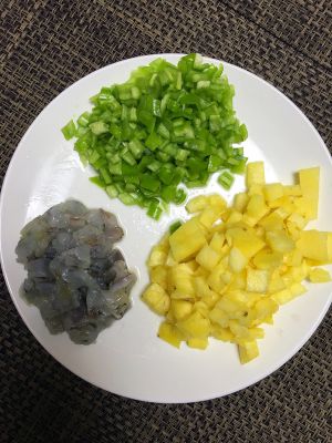 我买的菠萝带皮,没在水果摊处理。买回来对半切开,用刀子和勺子将一半的菠萝肉挖出来,切丁,如果米饭少可以用四分之一的菠萝,不然酸甜味会太重,切好的菠萝可以不用盐水泡。