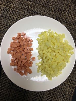 将所需要的食材切丁,:胡萝卜,火腿肠都是手切的,甜玉米粒和豌豆买的袋装。