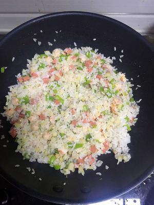 重新启锅,放油,把之前减下来的虾头倒进油锅煸出虾油,放入葱末爆香,倒入胡萝卜,炒胡萝卜的空可以把虾头挑出来。然后放入米饭,煸炒一会放入鲜虾,虾变色后倒入菠萝,炒好的鸡蛋,米饭炒至米粒成单颗并且米粒饱满,放盐调味,