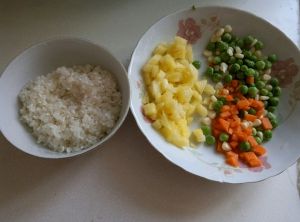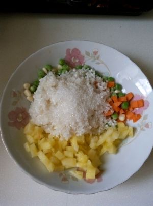 糯米提前泡1小时,菠萝肉切丁,胡萝卜切丁