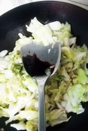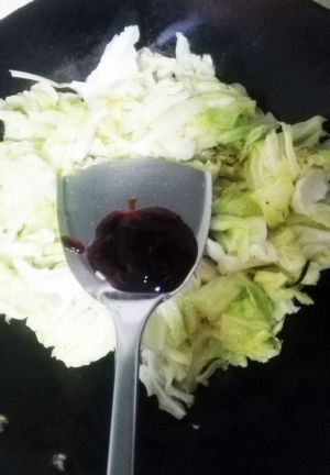 3、放入卷心菜,翻炒几下,稍变软,放入陈醋,继续炒,直到熟。