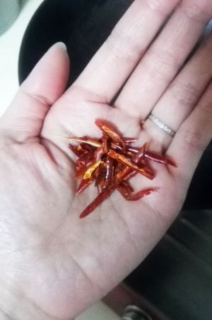 放一小撮干辣椒丝,干辣椒段也行,随意,份量根据口味而定,喜欢吃辣可以多放点。因为烧过花椒的油温已经比较高了,所以放入辣椒紧接着就要倒入准备好的包菜。