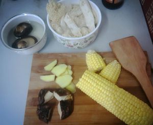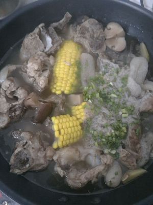 第二步:倒入2000ml的水、放排骨、生姜、番茄、肥肉、开大火煮开30分钟后转中小火 然后放入香菇、胡萝卜、玉米 再煮20分钟后,加入平菇、西蓝花、黄瓜 汤开5分钟后就可以放加入自己喜欢的素菜