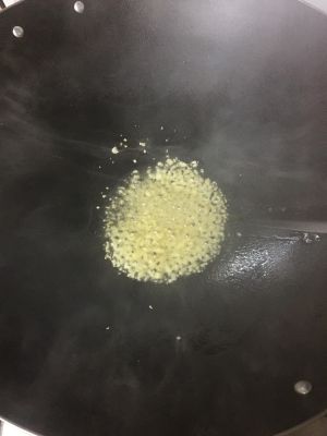 炸好茄子后倒出多余的油,留一点爆香姜蒜沫