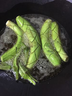 锅里倒入适量油,烧到油热就可以放茄子进去炸了,炸软后捞出。