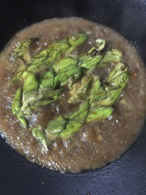 倒入茄子和酱汁,直到酱汁烧干放点葱花或者香菜起锅
