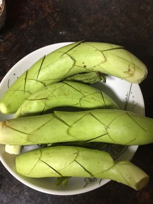 准备细长的茄子,用刀打花刀,不要切断,斜着切,左右前后轮流切,这样比较漂亮!