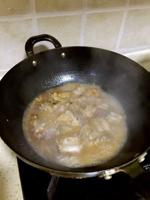 翻炒几下就可以把刚刚的排骨汤倒进超过里,汤不用全部没过排骨,大概2/3即可。炖到汤快没有的时候放小火收汁。