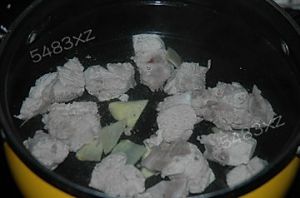 由于之前的照片没拍,我就一起说了。将小排洗净先放锅里过一下水,将血水煮出来,然后在高压锅中倒上开水,将过过水的小排倒进高压锅中,放几片姜片。先大火压出汽来,再将火调小一点压5分钟,即可关火。待高压锅中汽自动散完才可把肉捞出待用。