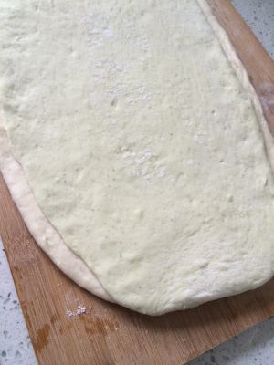 揉成面团醒发至两倍大(我大概醒了70分钟左右,室温22摄氏度)充分揉使之排气后擀开成长条形,两张面饼叠在一起