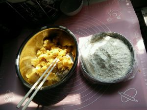 红薯带皮蒸熟再去皮,这样容易沥干,水分好控制,因为比较少,我是用石杵捣成泥,拌上糖,撑好酵母和面粉,拌匀。