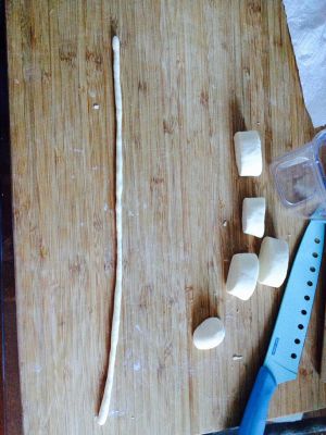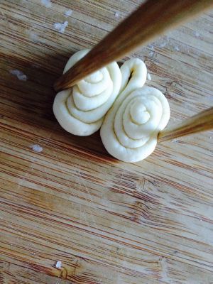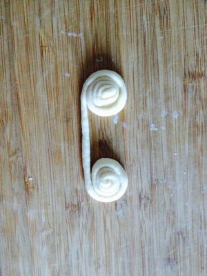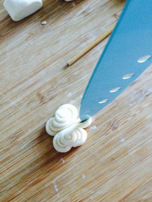 将发酵面团揉成长条,切成均匀的等份,取小小一份,揉成细细的均匀的长条。