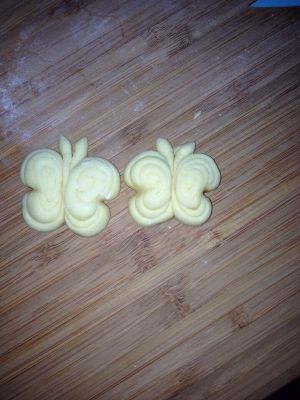 再取黄面条做领结点缀,用白面搓球黏在脸颊,画笔沾红色素上色