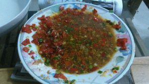 这里剁椒和豆豉是炒过的。下入茶油,油热下豆豉,用小火,以防糊锅,下剁椒,炒出香味或煸出红油即可。均匀的铺在鱼头上,撒下紫苏。