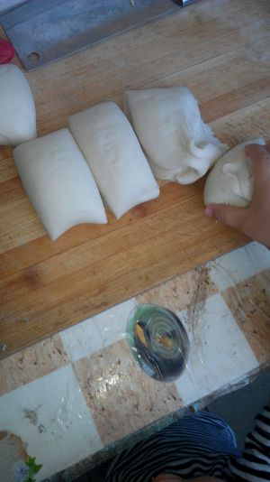 揉面 ,将面团里的空气排出,多揉会,待面团光滑时,搓成长条,均匀切开!忽视那捣乱的小手!
