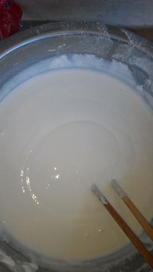 这时候趁醒面的功夫,准备年糕了。将江米粉倒入盆里加凉水搅拌,不能太稀也不能太稠,江米浆搅拌时有明显阻力时,划动时纹路明显不易消退时既可。