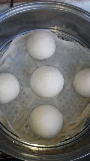 然后就是揉馒头了,揉好的放入锅里(锅里加入凉水,将纱布湿透)。