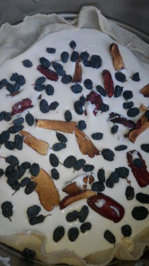 将米浆倒入蒸笼中(蒸笼中铺上湿透的纱布),洒上自己喜欢的果脯就可以了。手沾水轻拍果脯,让米浆和果脯更好的结合!