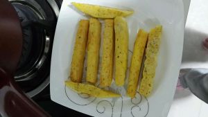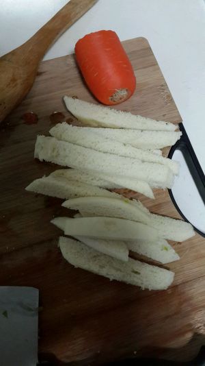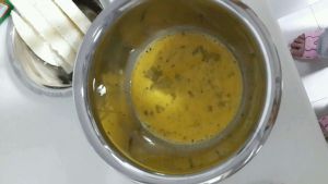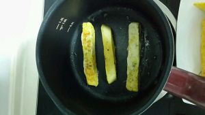 馒头条均匀裹上蛋液。下热锅煎。一定要是不粘锅。卖像才好看